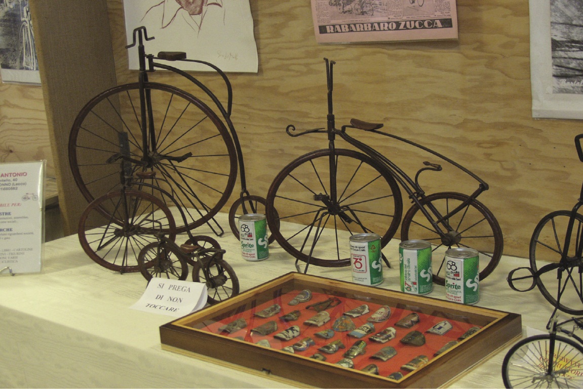 Il materiale esposto proviene dalla fornitissima collezione del signor PENATI ANTONIO di Nibionno, che annovera giornali che scrivono di ciclismo datati attorno al 1870 (per intenderci, l’Unità d’Italia aveva i calzoncini corti e Roma era appena diventata capitale), riviste specializzate di poco precedenti la grande guerra, gli originali (quelle in esposizione sono copie) della Domenica del Corriere trattanti il tema. E inoltre gagliardetti delle squadre italiane e straniere, delle federazioni di moltissimi paesi nel mondo, gadgets (spille, mostrine, quelle indimenticabili, per chi è stato ragazzino negli anni ’50 e ’60, palline con le foto degli assi del ciclismo), dischi, video, “garibaldini” del Giro d’Italia ed un numero di pregiati “pezzi unici”.
